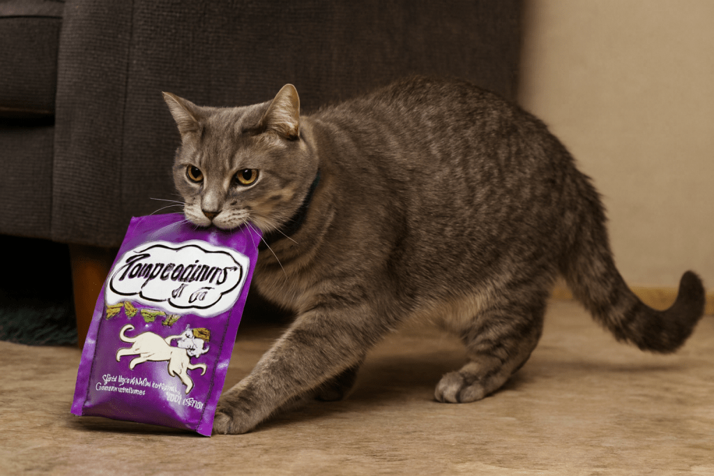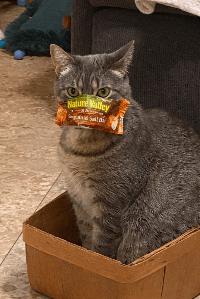Coco nods proudly with a granola bar wrapper stuck to her face. And waddles up dragging a bag of snacks she absolutely stole.