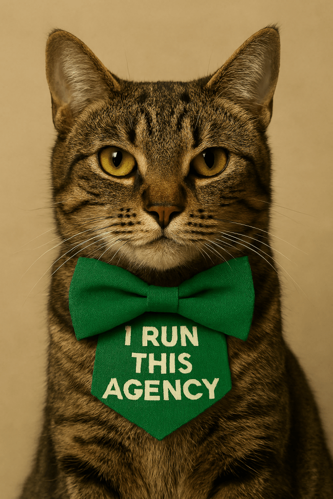 Piper, wearing her “I run this agency” bowtie. She steps onto the podium like she’s about to rewrite state law with a crayon. Coco is rustling through the official documents which is bold, considering she can’t read and also ate page three. Tinkerbell sits at the head of the table. Paws crossed. And radiating the kind of judgment that could shut down a whole committee hearing.