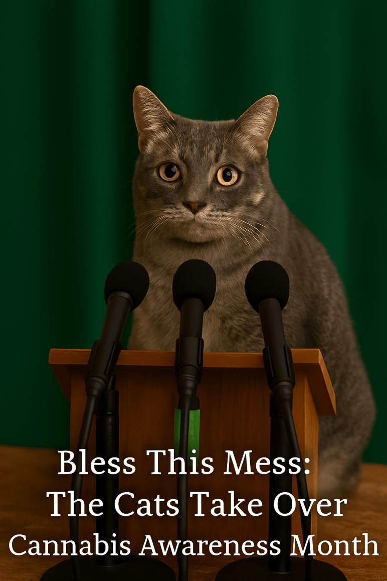Light the charcoal. Sprinkle the sage. Negative energy, go on and get. Today, we are gathered here in this living room that smells like lavender spray, and cat hair. This will officially kick off Cannabis Awareness Month under the watchful, judgmental, and wildly unqualified leadership of my three feline board members.