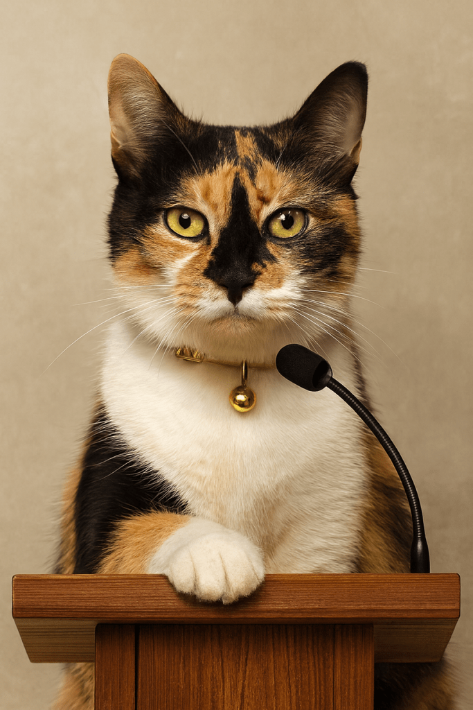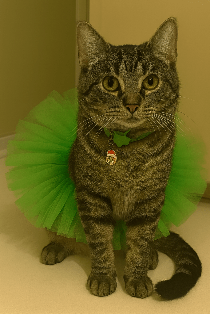 Piper has already climbed onto the podium wearing a green tutu like she’s the spiritual advisor of the entire Gulf South. Coco is in the corner eating something that is absolutely not food. And Tinkerbell is perched high above us all. And blinking slowly as if to say, “I cannot believe I share a mortgage with these people.” And she has no mortgage. So, take a breath. Set your intentions. Hide your snacks. The cats are ready to educate the public. And Lord help us. They have prepared statements.