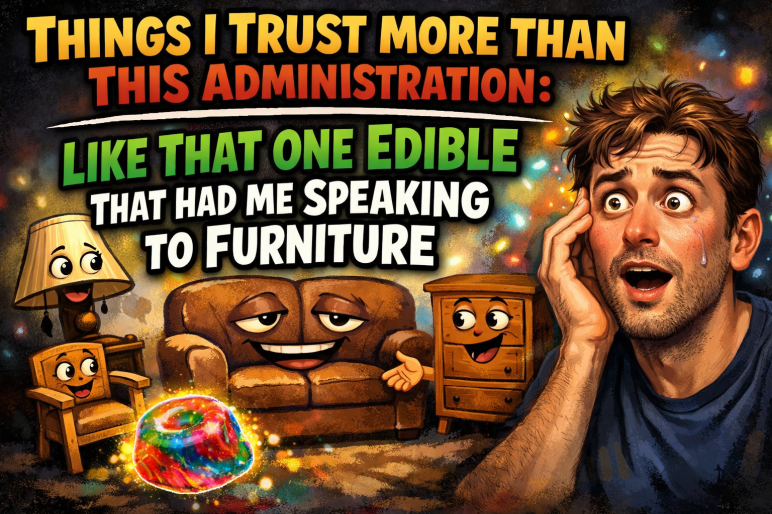 You know the one. The one that had you talking to your ancestors, your ex, and a lamp you thought was Beyoncé. And yet I still trust that edible more than I trust any “official plan” that starts with “We’re looking into it.”