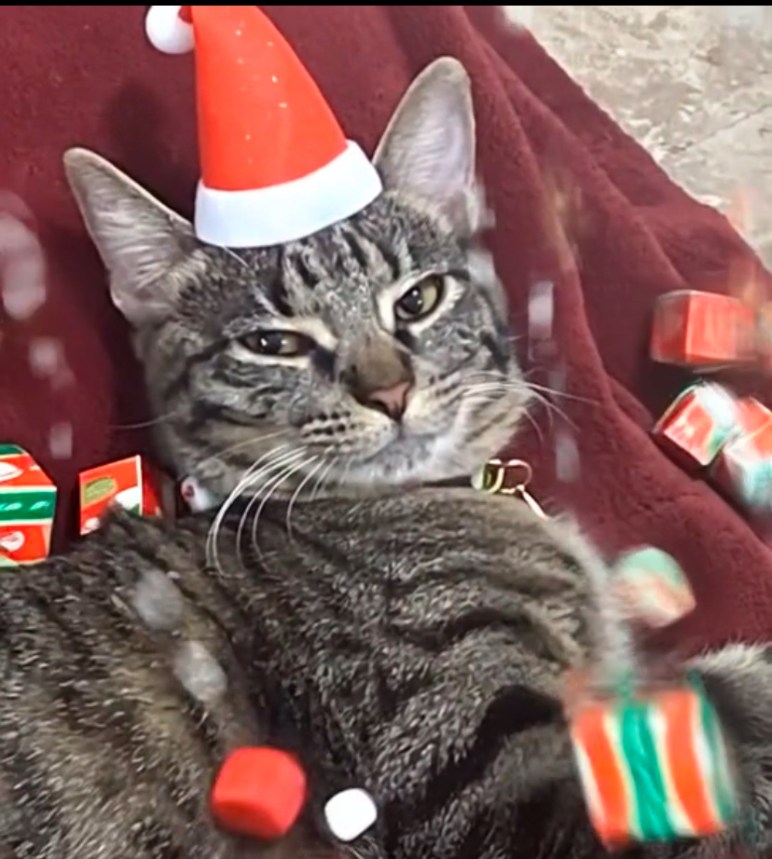 Me: “Well, it’s another holiday where we spend time together as a family. Except this time, we leave catnip and treats out for Kitty Claus.”